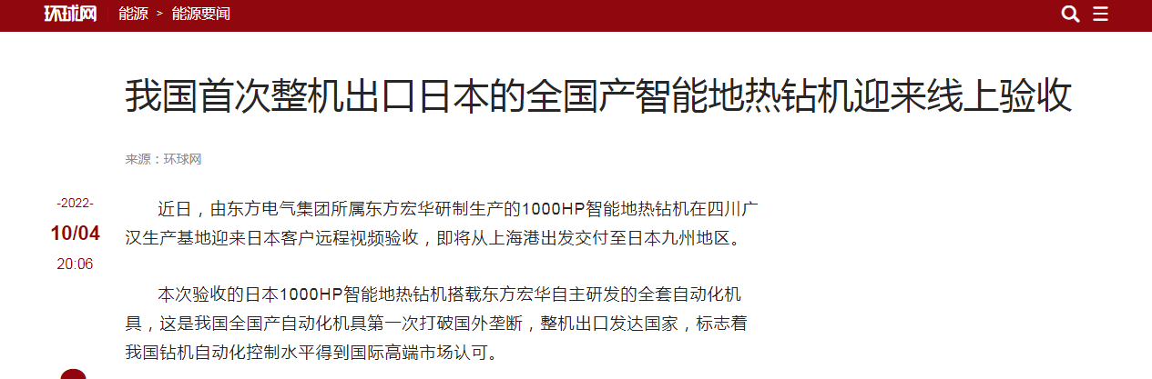 ±¾´ÎÑéÊÕµÄÈÕ±¾1000HPÖÇÄܵØÈÈ×ê»ú´îÔØ¶«·½ºê»ª×ÔÖ÷Ñз¢µÄÈ«Ì××Ô¶¯»¯»ú¾ß£¬ÕâÊÇÎÒ¹úÌìϲú×Ô¶¯»¯»ú¾ßµÚÒ»´ÎÍ»ÆÆÍâÑó¢¶Ï£¬Õû»ú³ö¿ÚÅ¹ú¼Ò£¬±ê¼Ç×ÅÎÒ¹ú×ê»ú×Ô¶¯»¯¿ØÖÆË®Æ½»ñµÃ¹ú¼Ê¸ß¶ËÊг¡ÈϿɡ£