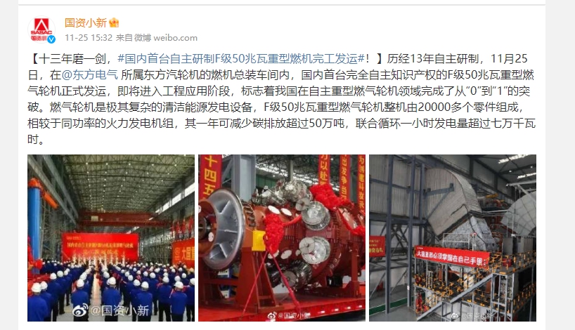 [国资小新]十三年磨一剑,#海内首台自主研制F级50兆瓦重型燃机完工发运#!
