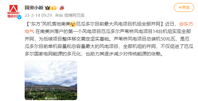 [国资小新]“东方”风机落地南美 厄瓜多尔现在最大风电项目机组所有并网