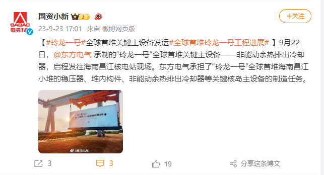 [国资小新]#玲龙一号#全球首堆要害主装备发运#全球首堆玲龙一号工程希望#