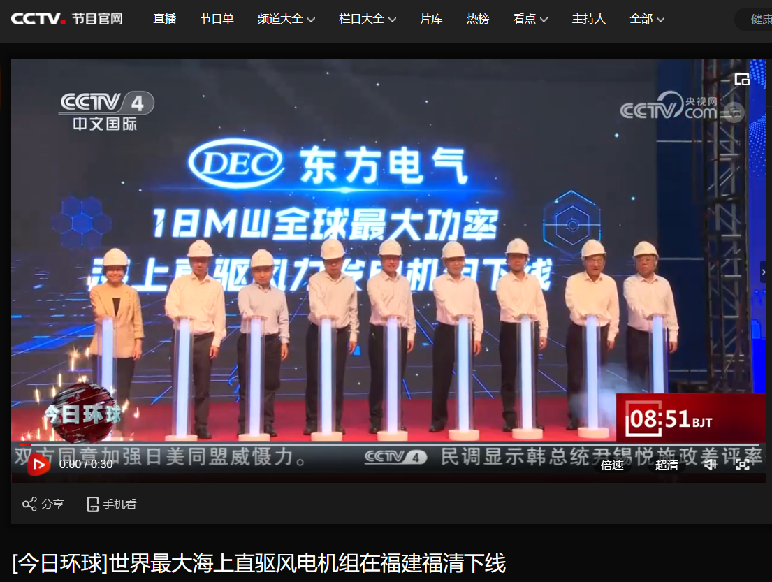 [央视今日环球]天下最大海上直驱风电机组在福建福清下线