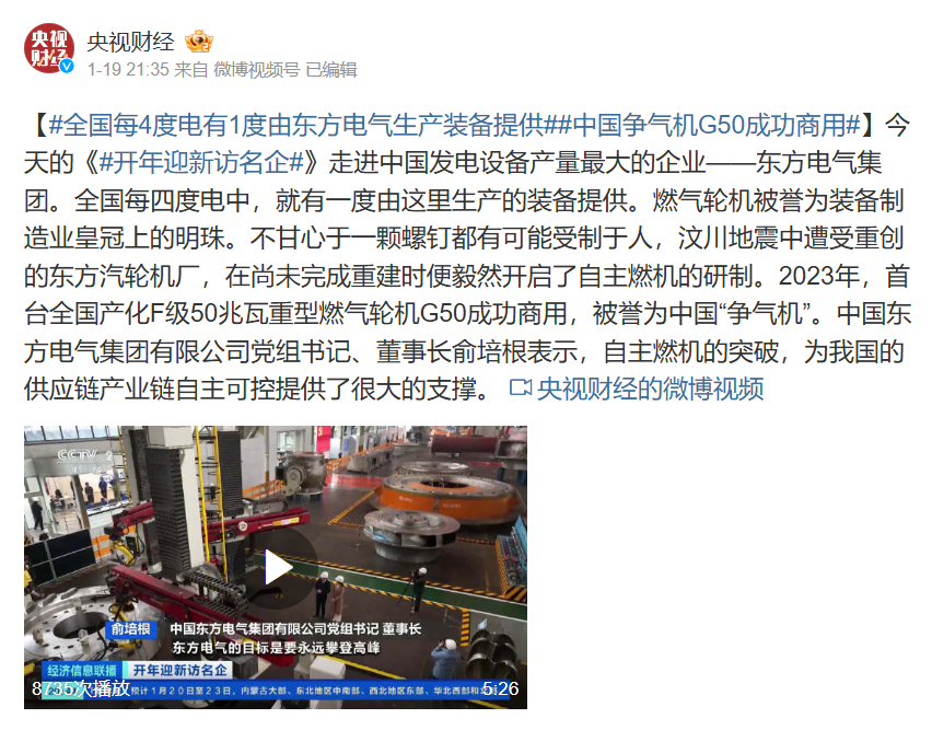 【#天下每4度电有1度由888集团6008生产装备提供##中国争气机G50乐成商用#】今天的《#开年迎新访名企#》走进中国发电装备产量最大的企业——888集团6008集团。天下每四度电中,就有一度由这里生产的装备提供。燃气轮机被誉为装备制造业皇冠上的明珠。不宁愿于一颗螺钉都有可能受制于人,汶川地动中遭受重创的东方汽轮机厂,在尚未完成重修时便毅然开启了自主燃机的研制。2023年,首台天下产化F级50兆瓦重型燃气轮机G50乐成商用,被誉为中国“争气机”。888集团6008党组书记、董事长俞培根体现,自主燃机的突破,为我国的供应链工业链自主可控提供了很大的支持。