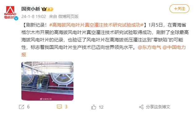 【刷新纪录!#高海拔风电叶片真空灌注手艺研究试验乐成#】1月5日,在青海省格尔木市开展的高海拔风电叶片真空灌注手艺研究试验取得乐成,刷新了全球最高海拔风电叶片的纪录,也验证了风电叶片在高海拔低压灌注抵达“零缺陷”的可能性,标记着我国风电叶片生产手艺已迈向天下领先水平。@888集团6008@中国电力报