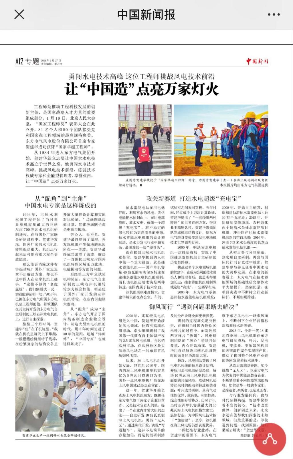 [中国新闻报]勇闯水电手艺岑岭 这位工程师挑战风电手艺前沿 让“中国造”点亮万家灯火