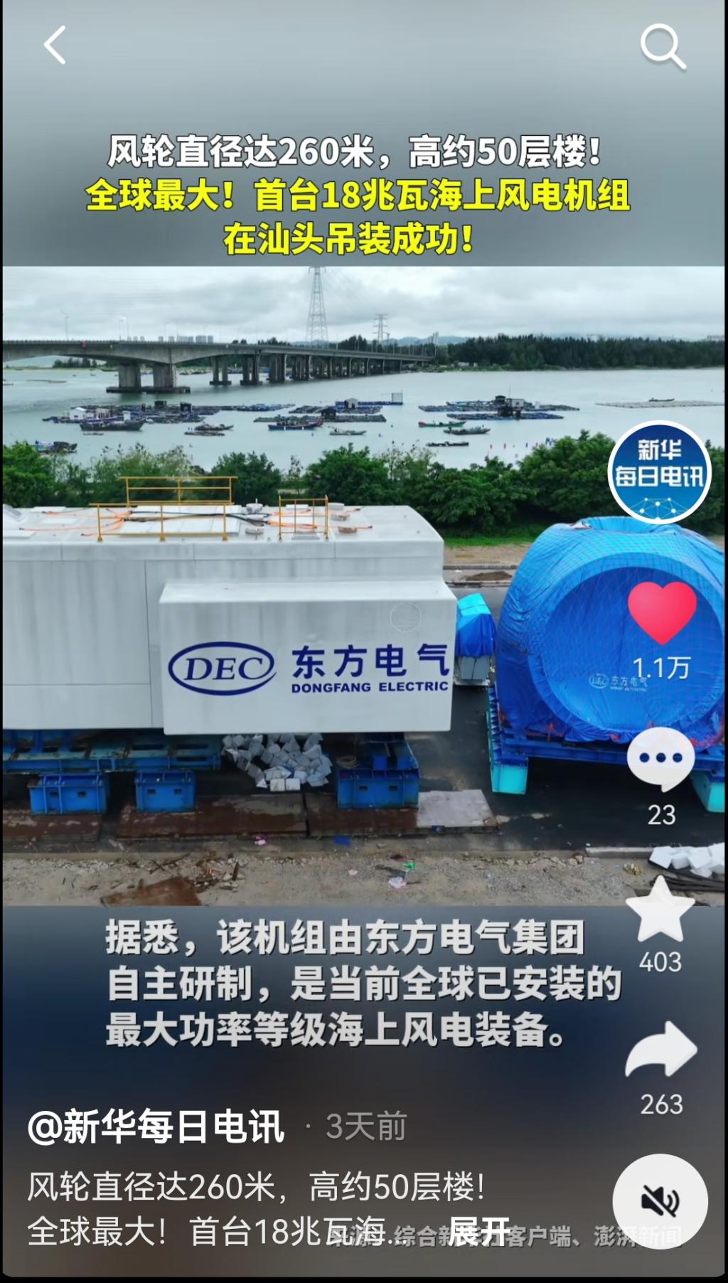 [新华逐日电讯抖音]风轮直径达260米,高约50层楼!全球最大!首台18兆瓦海优势电机组在汕头吊装乐成!