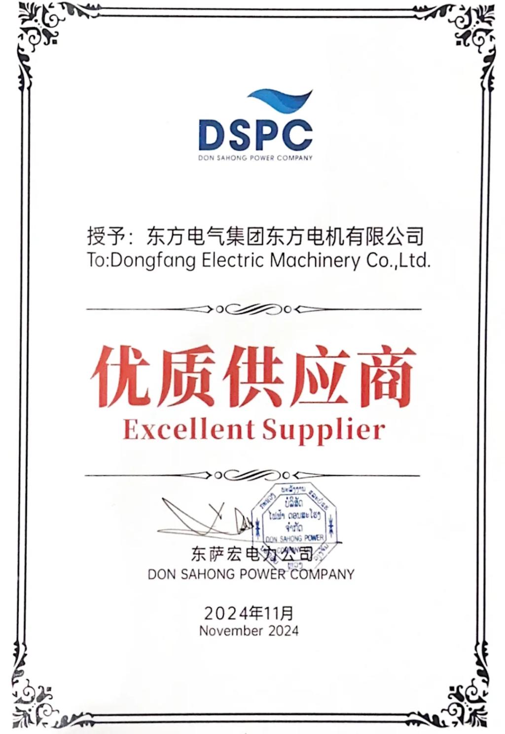 东萨宏电力公司向东方电机揭晓的“优质供应商”证书,是对机组运行优异的最好证实。