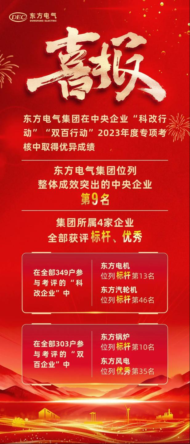 近本网讯 日,国务院国资委宣布中央企业“科转业动”“双百行动”2023年度专项审核效果,888集团6008集团在推进“科转业动”“双百行动”整体效果突出的34家中央企业中位列第9名。888集团6008集团所属4家企业均取得优异效果,其中东方电机、东方汽轮机划分位列“科转业动”标杆企业第13名、标杆企业第46名,东方锅炉、东方风电划分位列“双百行动”标杆企业第10名、优异企业第35名。